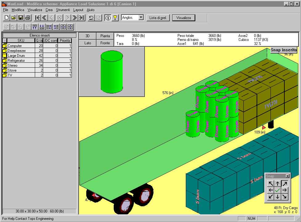 Anagrafica veicoli. La definizione dei veicoli viene fatta in modo analogo a quella dei pallet. Un veicolo in generale é caratterizzato da: descrizione, tipo, lunghezza, larghezza, altezza, peso massimo di carico, tara, dimensioni e caratteristiche degli sbalzi anteriore e posteriore, numero e posizione degli assi, posizione del perno di traino. I veicoli possono essere containers, camions, carri ferroviari (anche con la volta a botte), container aerei. La definizione dei camion prevede anche la distinzione tra motrice e rimorchio: Maxload Pro provvede al carico di entrambe i volumi contemporaneamente. Caricamento di un veicolo. Maxload Pro propone una schermata suddivisa in 4 parti. In alto a sinistra si trova l'anagrafica dei veicoli disponibili accessibile attraverso un elenco a discesa, l'immagine del veicolo selezionato viene visualizzata nella parte superiore destra della schermata, completa delle sue dimensioni. L'anagrafica dei colli da caricare già presenti nel database si trova nella parte inferiore sinistra. In ultimo, in basso a destra troviamo la lista di carico che può essere anche importata dal gestionale, qualunque esso sia. |